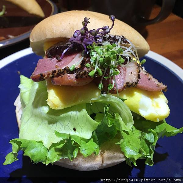 大量蔬菜層層堆疊 . 夾上厚蛋跟鴨胸,再以苜蓿芽點綴