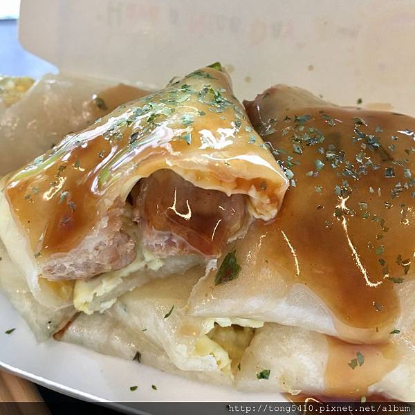 ▲他們家的蛋餅皮是薄的,上頭淋了很多醬油膏