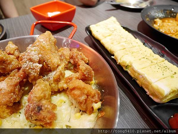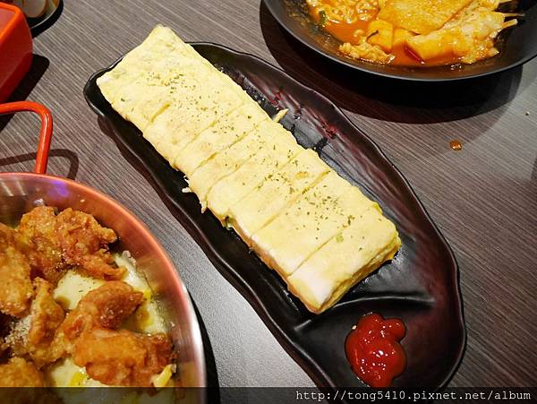 所以四個人點 一份炸雞 / 一份炒年糕起司泡麵 / 一個起司雞蛋捲