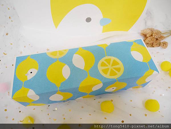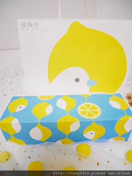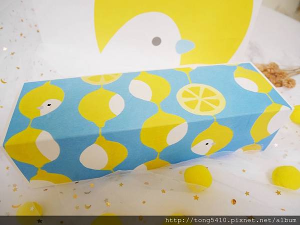 檸檬跟鳥兒的圖形交疊 . 黃跟藍本來就又是對比色 .