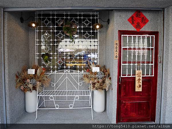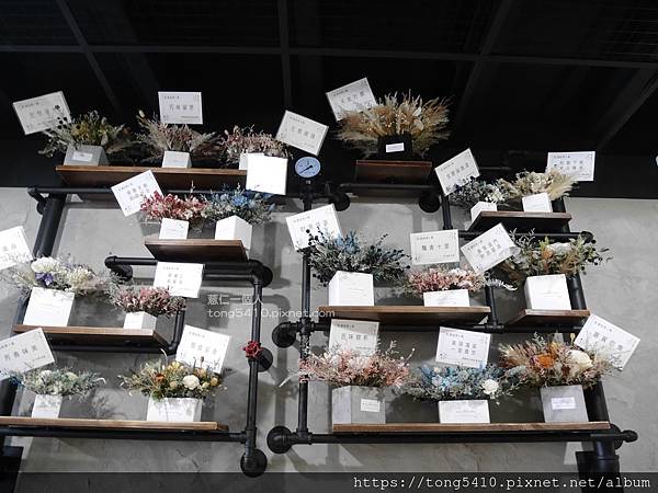 ▲牆上的水管壁飾放了好多祝賀乾燥花盆