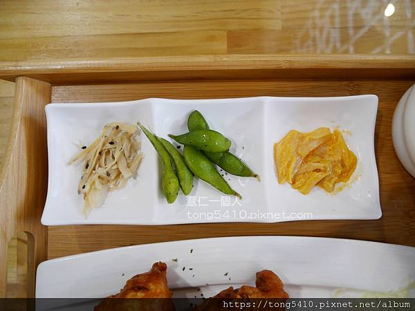 ▲三樣小菜有牛蒡絲 毛豆 泡菜。都是現成日式風味的
